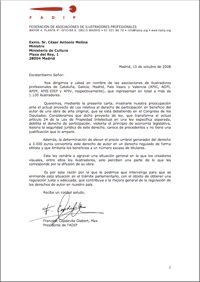 Os remito la carta que desde FADIP hemos enviado, recientemente, al Ministro de Cultura, acerca del proyecto de Ley relativo al derecho de participación, que se está debatiendo en el Congreso de los Diputados.